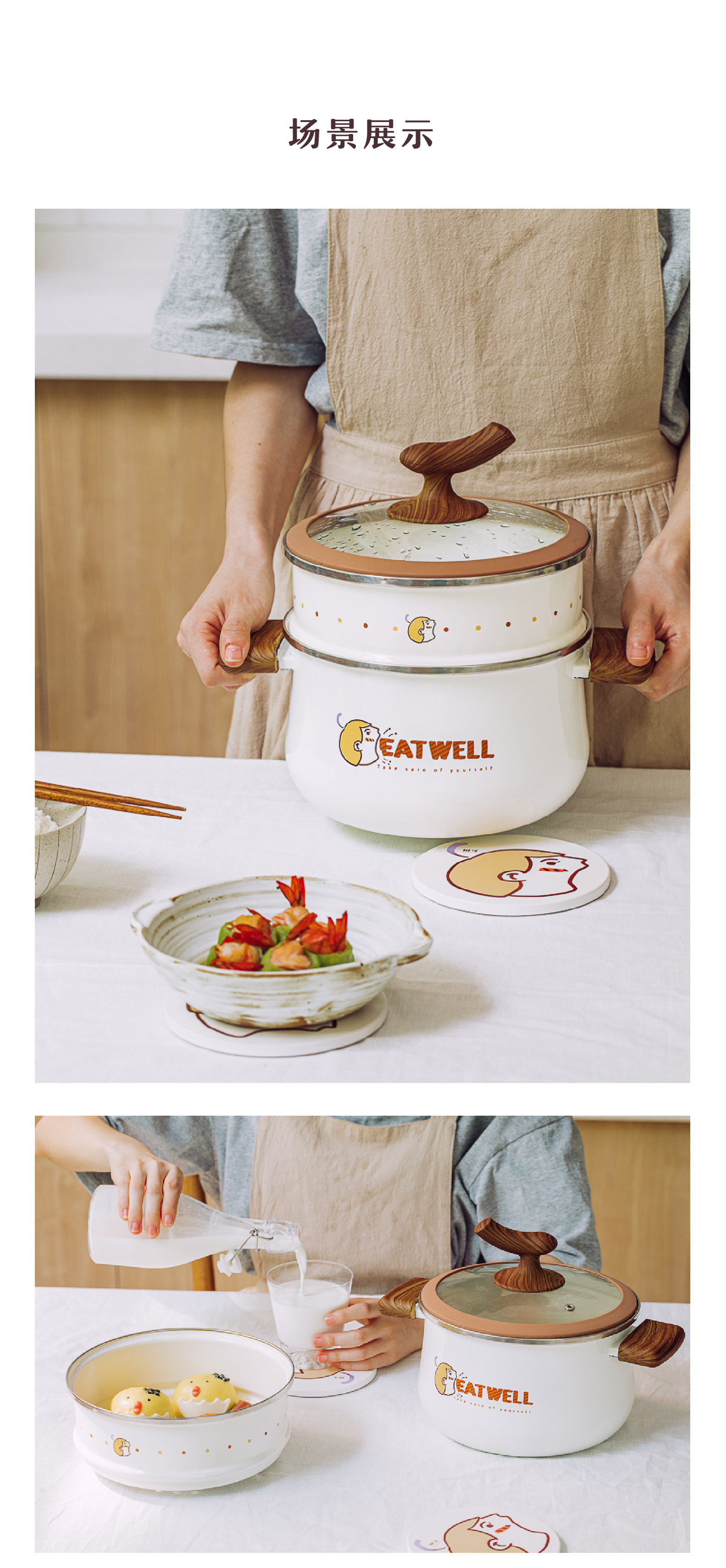 因为现在大家对健康更关注,蒸煮的方式少油少盐,又能zui大程度保留营养,所以越来越受欢迎,倡导健康生活方式的树可怎么会少了蒸锅呢。这款福气蒸锅是专门为小家庭设计,圆肚造型的锅体,像一个福袋,寓意福气满满,乳白色的锅体加上栗色的把手滴子,可爱有颜值。蒸煮一体,看着不大,其实容量不小,小家庭煮个汤煲个粥,绰绰有余。可叠放的蒸屉,同时蒸和煮,高效方便,正是我们忙碌的打工人需要的!好用的蒸锅用起来,和大口君一起好好吃饭呀!